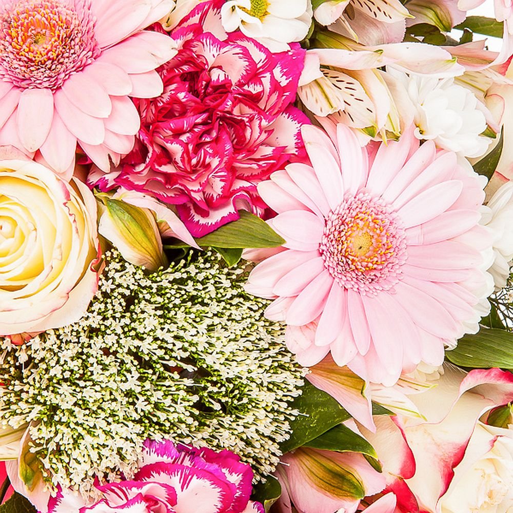 Exclusive Roses, Mini Gerberas, Santini Chrysanthemums, Gypsophila, Alstroemerias, Carnations & Decorative greenery (32 stems)